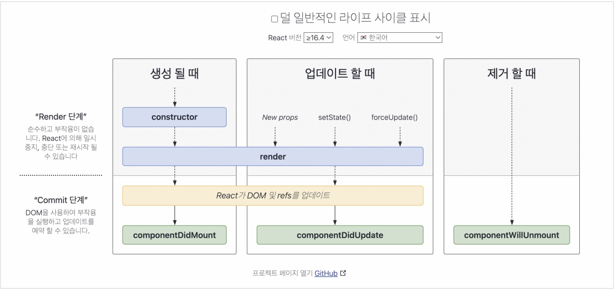 - 생명주기 메서드는 React.Component에서 오기 때문에 이를 상속받아서 구현하는 클래스 컴포넌트에서만 생명주기 메서드가 사용가능하다.