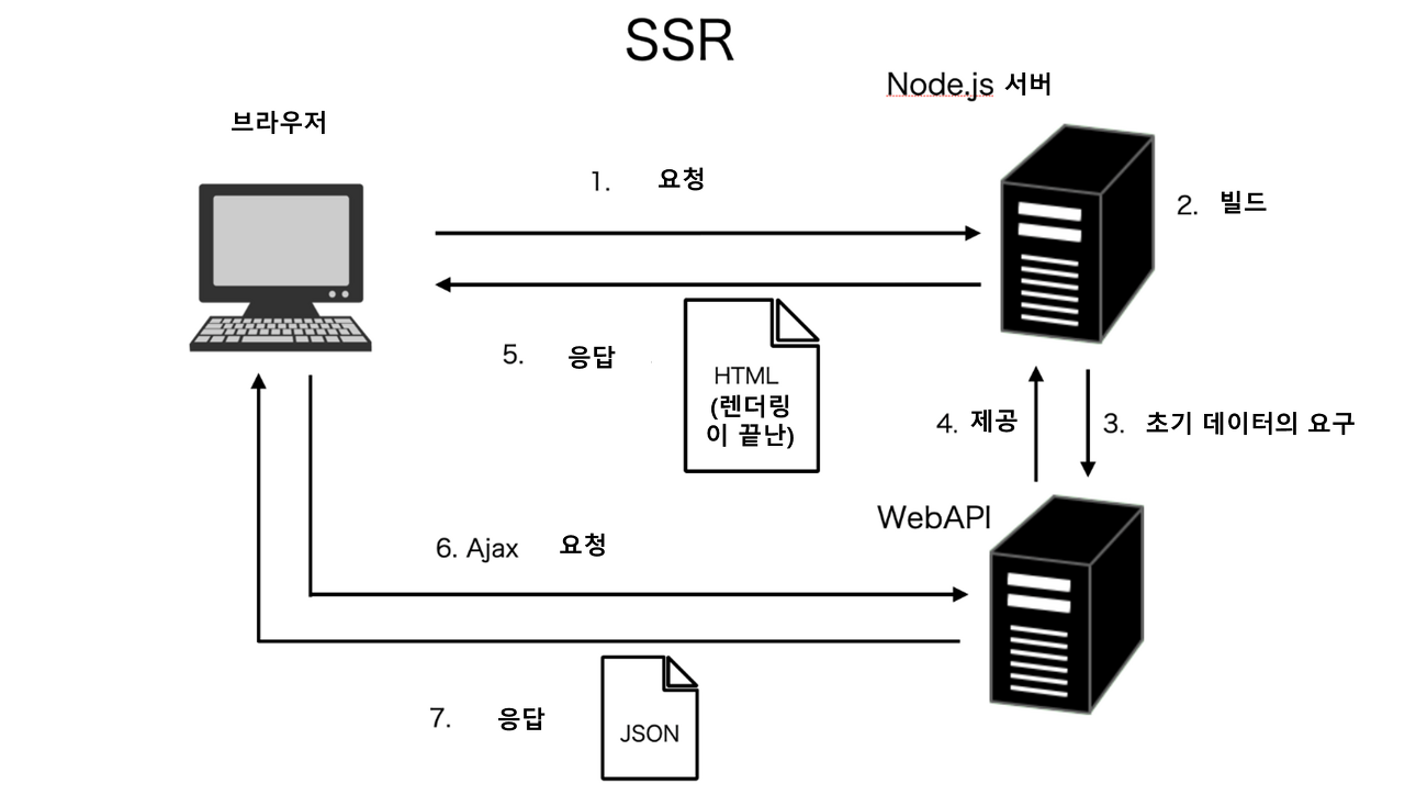 - SPA는 정적인 데이터인 자바스크립트와 HTML만 제공하면 되지만 SSR는 사용자의 요청을 받아 렌더링을 수행할 서버가 필요하다.