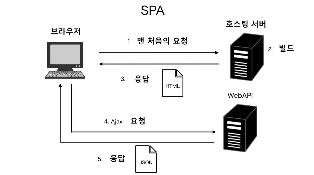 - 따라서 첫 페이지를 불러온 후에는 서버에서 내려받을 필요없이 하나의 페이지에서 모든 작업을 처리하므로 싱글 페이지 애플리케이션이라고 한다.